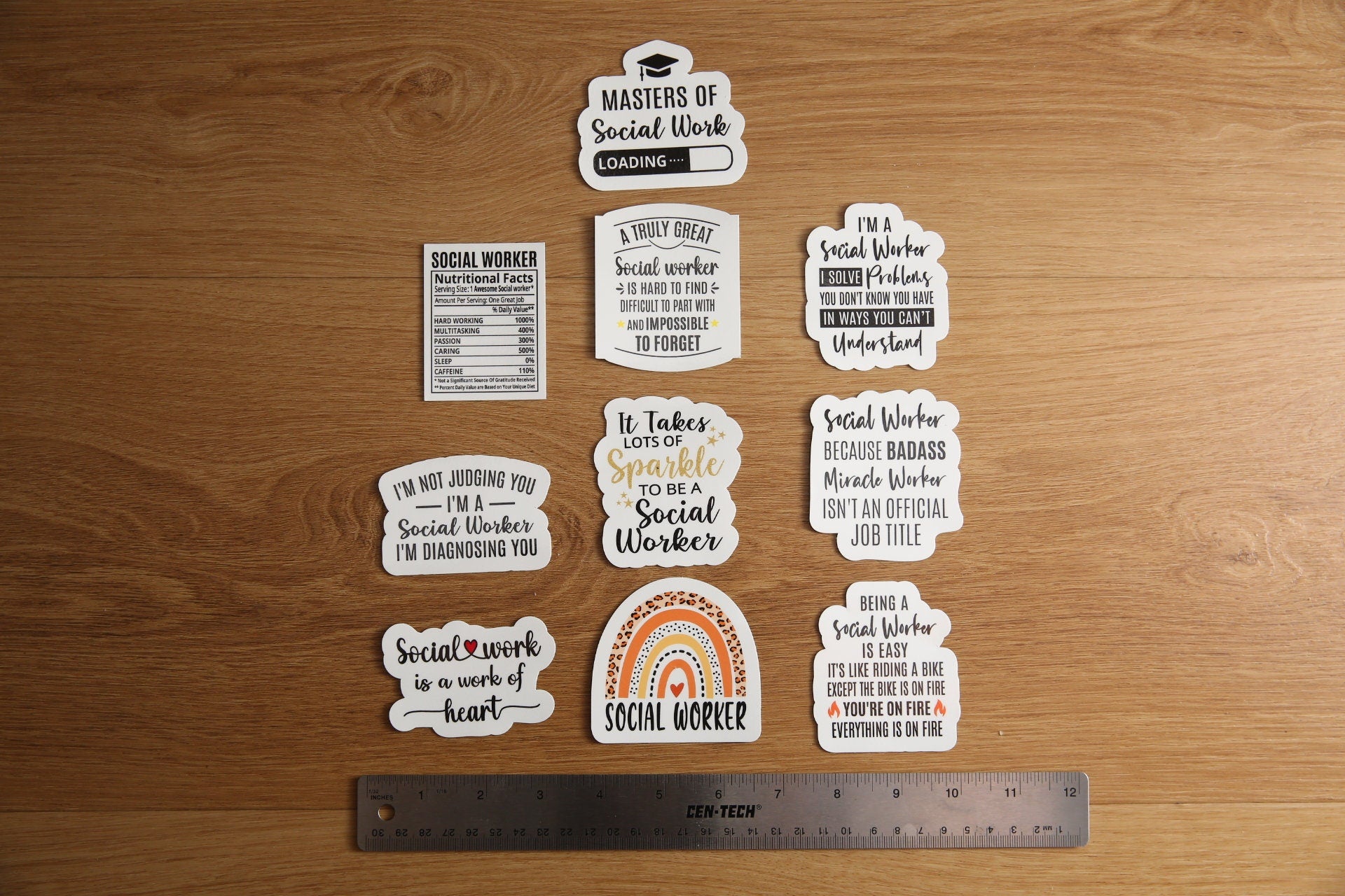 The Social Worker Vinyl Sticker Pack SET 1 includes 10 stickers. The stickers average about 3" Wide and vary in height (3" or less).