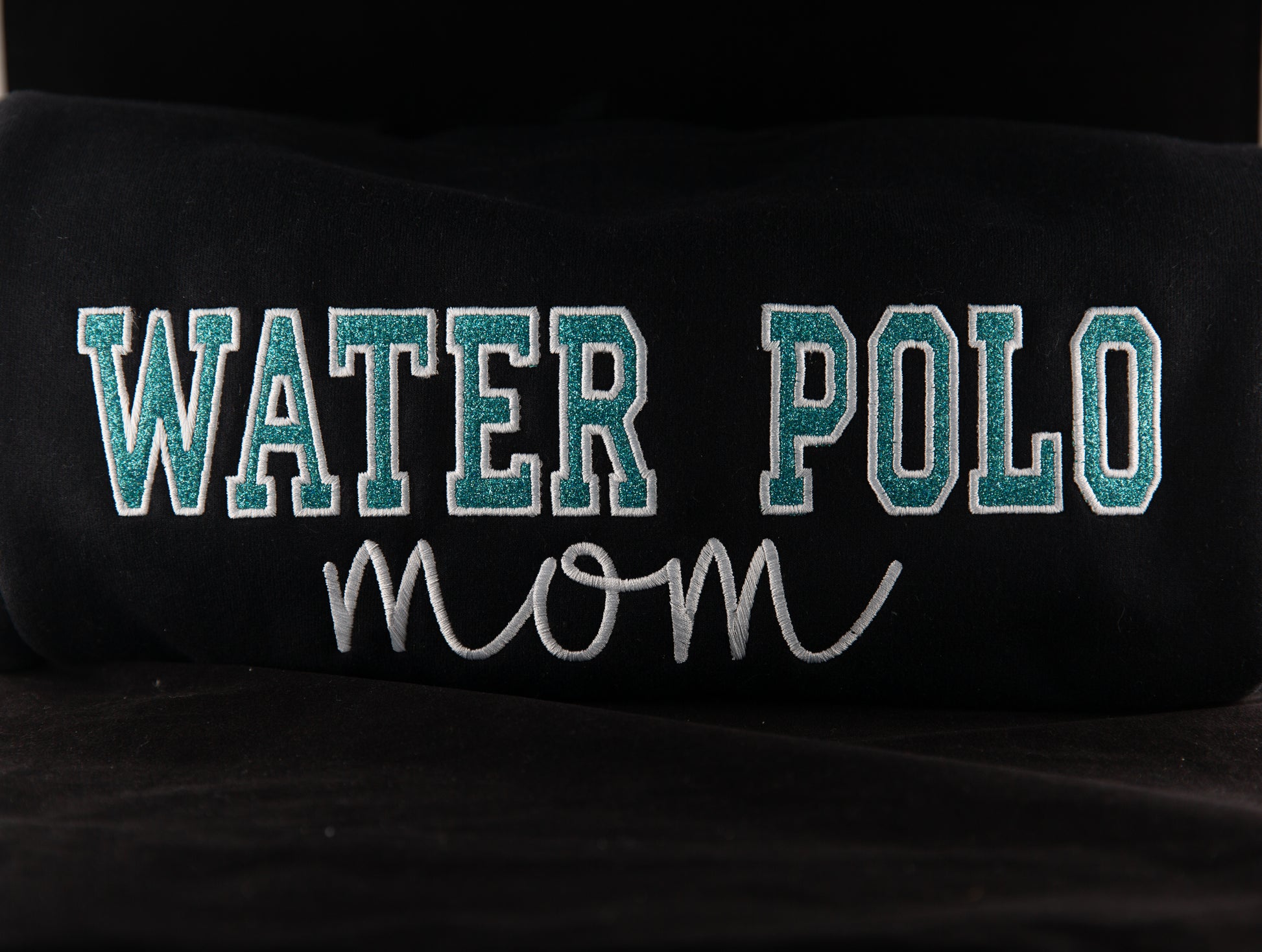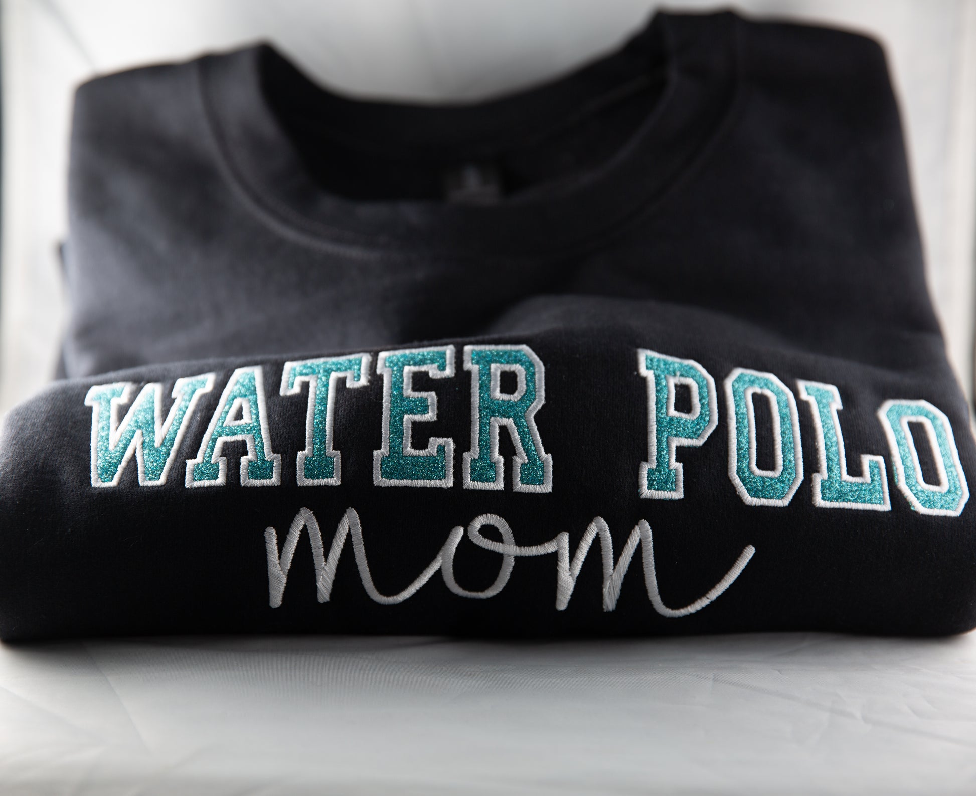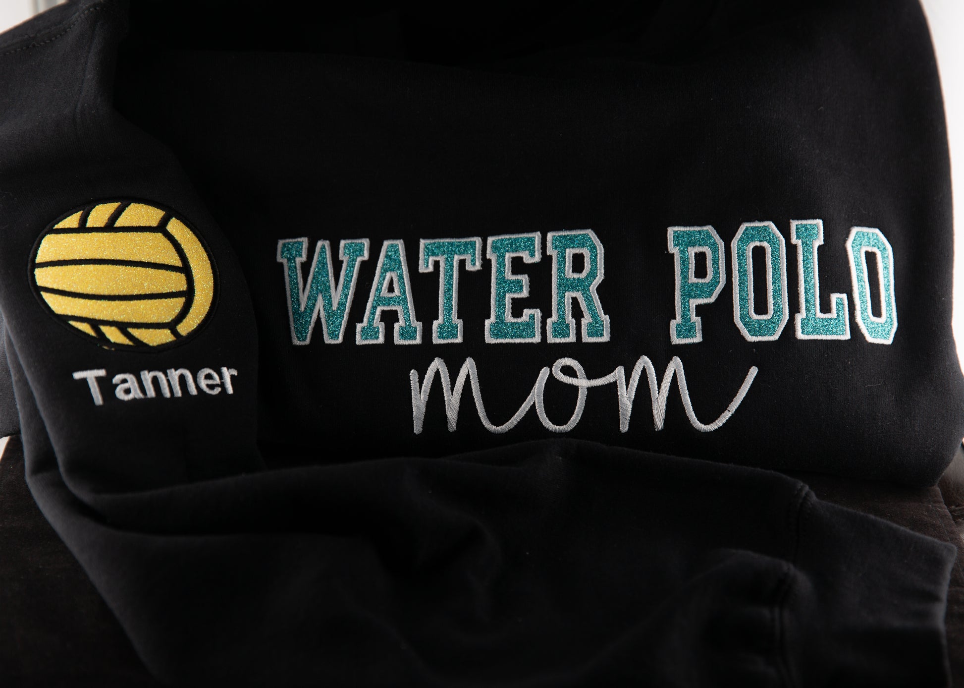 🏊♂️ Stand out on the pool deck with our custom embroidered Water Polo Mom sweater! Perfect for those long tournament days, this cozy sweater features intricate embroidery celebrating your athlete. Show your team spirit in style while staying warm during early morning practices and evening games. Each piece is individually crafted with care, making it as unique as your water polo star. Sweaters are black in color, with "Water Polo" in Aqua Glitter. The water polo ball is Yellow glitter. Order now to join our proud community of water polo moms!